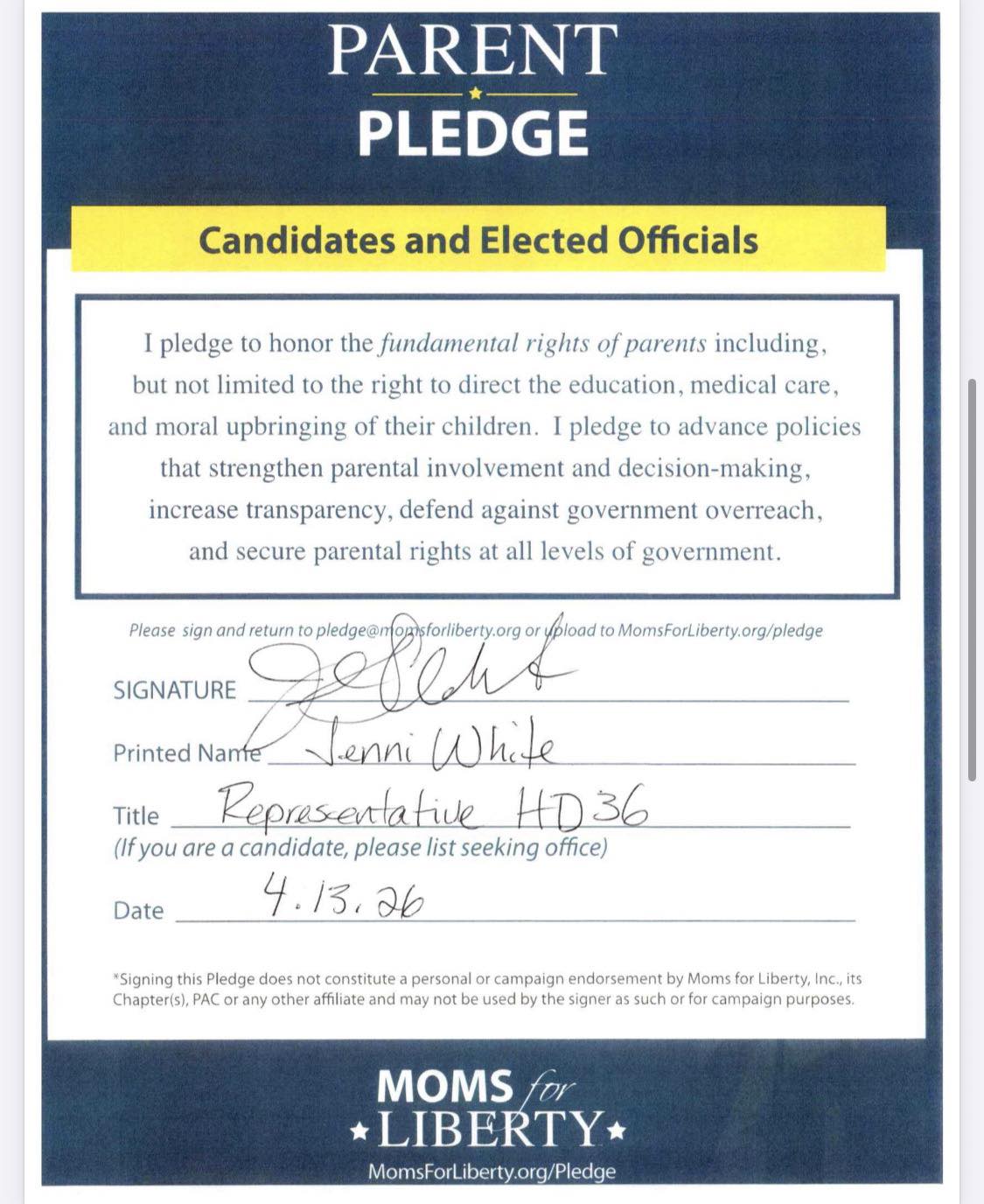Endorsements, Surveys and Pledges Jenni recieving an Eagle Award from Phyllis Schlafly, 2014 Oklahoma Second Amendment Association Receieved an ‘A’ rating on OK2A’s Candidate Survey Make Oklahoma Healthy Again Received an ‘A’ rating on MOHA’s Candidate Survey